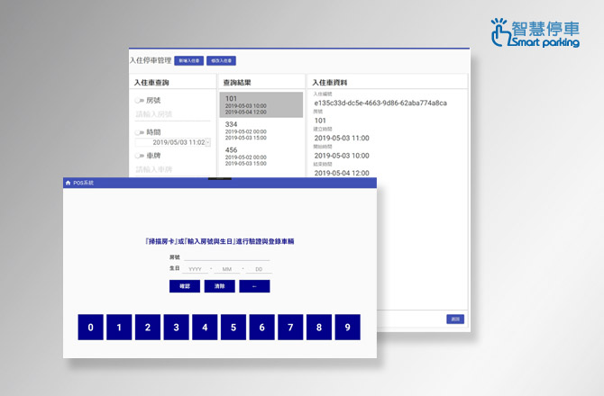 อินเทอร์เฟซหน้าจอดการจัดการใช้ RWD สำหรับความละเอียดหน้าจอต่างๆ เชื่อมต่อกับระบบจัดการที่จอดรถของโรงแรม ท่านสามารถเพิ่มข้อมูลรถยนต์ขณะเช็คอินได้โดยตรงที่แผนกต้อนรับ รวมถึงหมายเลขห้องพัก หมายเลขรถยนต์ และเวลาที่เริ่มใช้งาน ... เป็นต้น หลังจากลงทะเบียนเรียบร้อยแล้ว รถของแขกผู้เข้าพักที่ลงทะเบียนไว้ สามารถเข้าและออกลานจอดรถของโรงแรมได้ฟรี